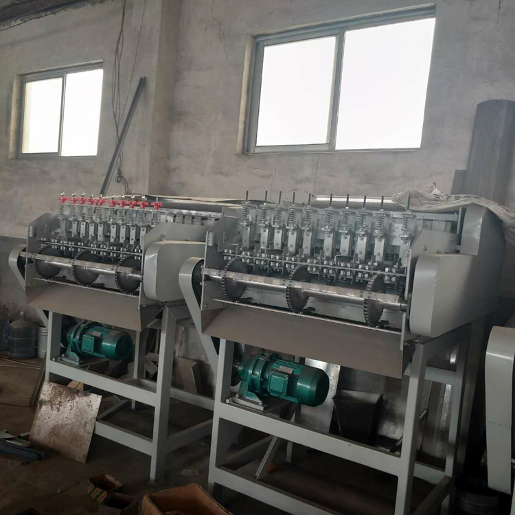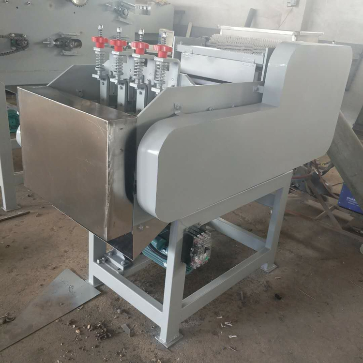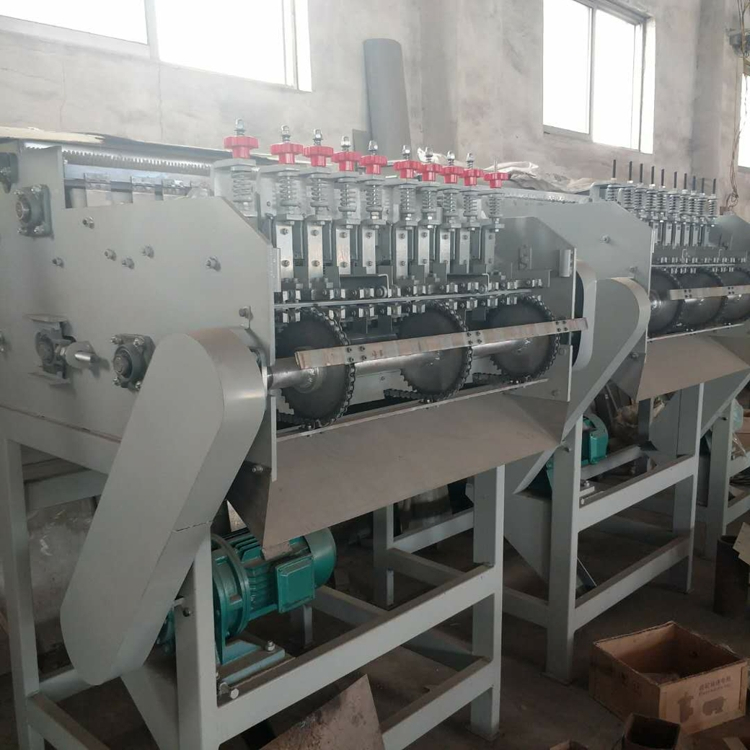 It is mainly used for shelling cashew nuts. The equipment has the characteristics of stable operation, low material damage rate and high shelling efficiency. After grading, the cashew nuts are shelled, and the shelling rate of cashew nuts and the whole kernel rate can reach 95%. The equipment divides the materials into various guide grooves through the material distribution device on the hopper, and the motor drives the attachment plate on the chain to move it toward the knife body to realize cutting.