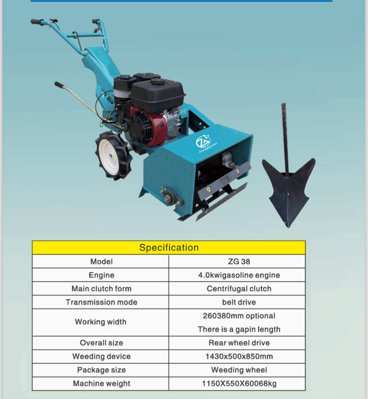 The ZG 38 Mini Power Tiller boasts a powerful 4kw gasoline engine and utilizes a belt drive for optimal performance. Experience efficient and effortless soil preparation with this compact and reliable machine.